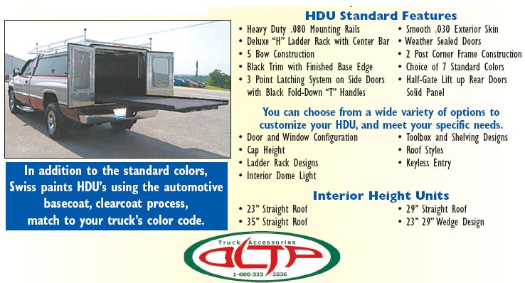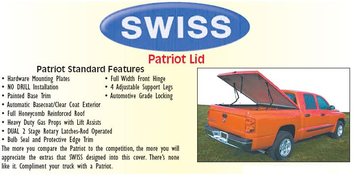Complete line of Swiss Truck Caps with many options available such as dome lights, slide windows, fabric headliner and keyless entry.